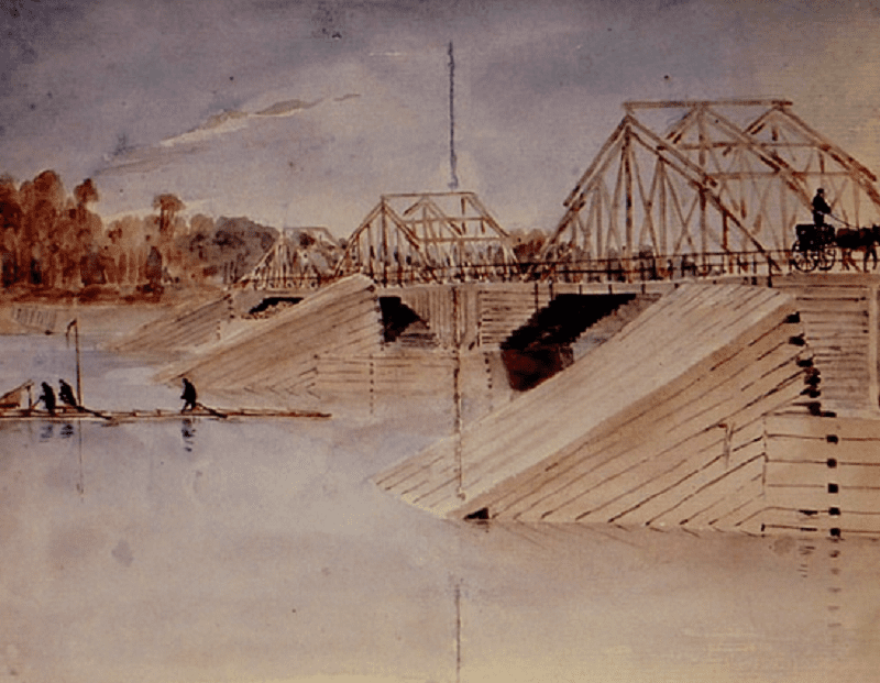 Un an après l’ouverture du pont, Lachapelle faillit incendier sa propre création. En tant que leader du mouvement patriote local, il envisageait de détruire le pont pour empêcher les troupes britanniques de passer. Toutefois, les Britanniques traversèrent finalement la rivière sur la glace, épargnant ainsi le pont. À l’époque, les ponts étaient construits partiellement en bois et en pierre.