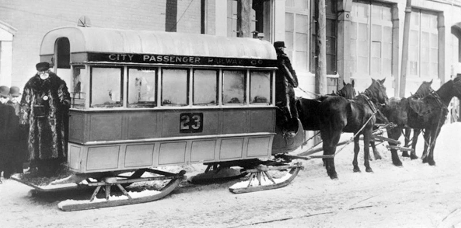 Для этого вагоны были заменены огромными санями, которые могли вместить до тридцати пассажиров. Стоит отметить, что одни из таких саней, транспортное средство довольно необычной формы, сохранились в Монреале до наших дней. То же касается омнибуса — транспортного средства с очень высокими колесами, которое использовалось компанией весной, когда рельсы были еще покрыты снегом и грязью.